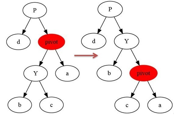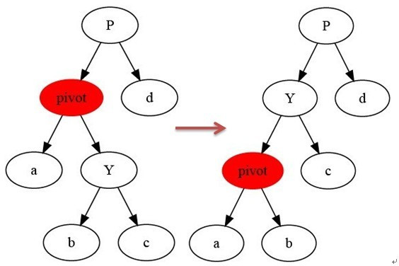 左旋以pivot到y之间的链为“支轴”进行,它使y成为该孩子树新的根,而y的左孩子b则成为pivot的右孩子。