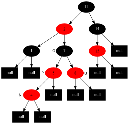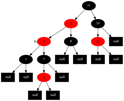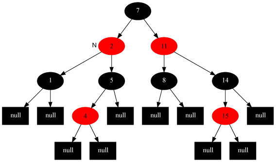 • 如果插入的是根结点,因为原树是空树,此情况只会违反性质2,所以直接把此结点涂为黑色。