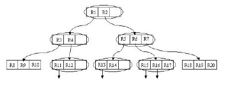 下面就可以把这些大大小小的矩形存入我们的R树中去了。根结点存放的是两个最大的矩形,这两个最大的矩形框住了所有的剩余的矩形,当然也就框住了所有的数据。下一层的结点存放了次大的矩形,这些矩形缩小了范围。每个叶子结点都是存放的最小的矩形,这些矩形中可能包含有n个数据。