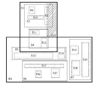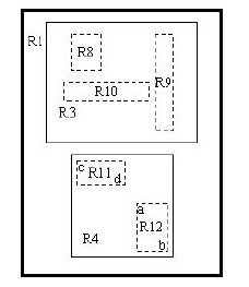- 同样道理,R15,R16被R6恰好框住,R11,R12被R4恰好框住,等等。所有最基本的最小边界矩形被框入更大的矩形中之后,再次迭代,用更大的框去框住这些矩形。
