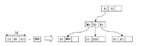 我们来通过图分析一下插入操作。现在我们需要插入R21这个矩形。开始时我们进行ChooseLeaf操作。在根结点中有两个条目,分别为R1,R2。其实R1已经完全覆盖了R21,而若向R2中添加R21,则会使R2.I增大很多。显然我们选择R1插入。然后进行下一级的操作。相比于R4,向R3中添加R21会更合适,因为R3覆盖R21所需增大的面积相对较小。这样就在B8,B9,B10所在的叶子结点中插入R21。由于叶子结点没有足够空间,则要进行分裂操作。