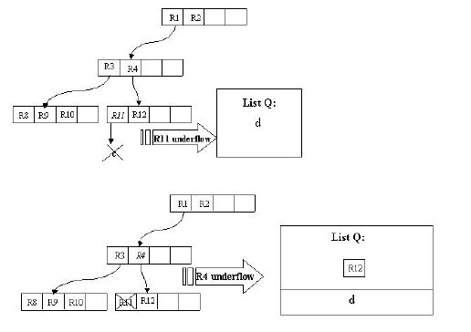 假设结点最大条目数为4,最小条目数为2。在这张图中,我们的目标是删除记录c。首先使用FindLeaf操作找到c所处在的叶子结点的位置——R11。当c从R11删除时,R11就只有一条记录了,少于最小条目数2,出现下溢,此时要调用CondenseTree操作。这样,c被删除,R11剩余的条目——指向记录d的指针——被插入链表Q。然后向更高一层的结点进行此操作。这样R12会被插入链表中。原理是一样的,在这里就不再赘述。