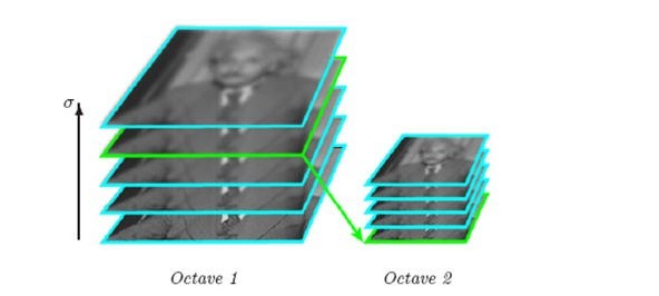 图像金字塔的建立:对于一幅图像I,建立其在不同尺度(scale)的图像,也成为子八度(octave),这是为了scale-invariant,也就是在任何尺度都能够有对应的特征点,第一个子八度的scale为原图大小,后面每个octave为上一个octave降采样的结果,即原图的1/4(长宽分别减半),构成下一个子八度(高一层金字塔)。