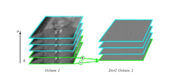 在尺度空间建立完毕后,为了能够找到稳定的关键点,采用高斯差分的方法来检测那些在局部位置的极值点,即采用俩个相邻的尺度中的图像相减,即公式定义为: