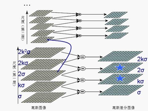 因为需要同相邻尺度进行比较,所以在一组高斯差分图像中只能检测到两个尺度的极值点(如上述第二幅图中右图的五角星标识),而其它尺度的极值点检测则需要在图像金字塔的上一层高斯差分图像中进行。依次类推,最终在图像金字塔中不同层的高斯差分图像中完成不同尺度极值的检测。