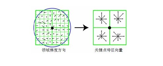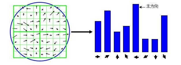 上图,图5中左部分的中央黑点为当前关键点的位置,每个小格代表关键点邻域所在尺度空间的一个像素,箭头方向代表该像素的梯度方向,箭头长度代表梯度模值,图中蓝色的圈代表高斯加权的范围(越靠近关键点的像素梯度方向信息贡献越大)。
